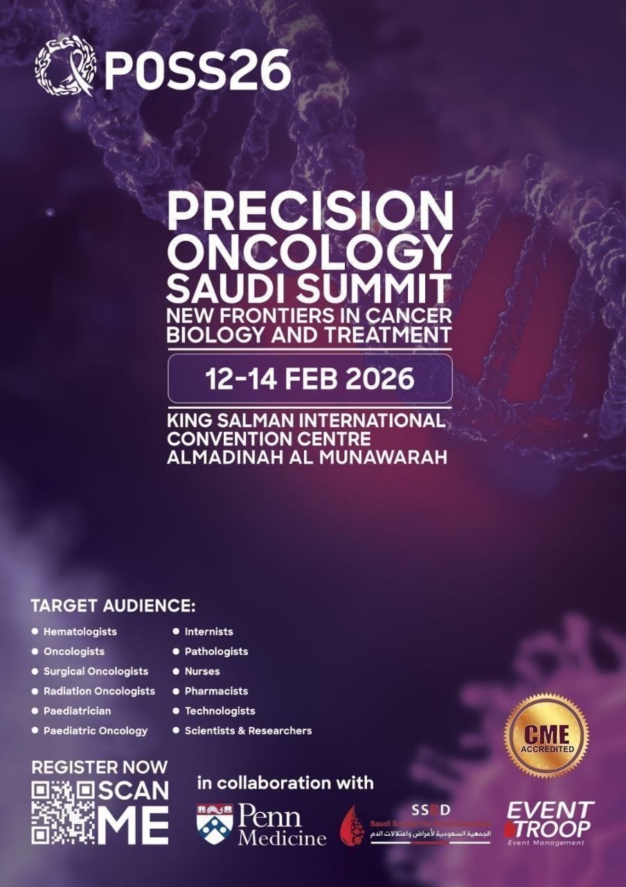 The Precision Oncology Saudi Summit (POSS26) is a major scientific gathering dedicated to advancing cancer care through the latest innovations in precision medicine. Held from 12–14 February 2026 at the King Salman International Convention Centre in Al-Madinah Al-Munawarah, the summit brings together leading international and regional experts in cancer biology, genomics, diagnostics, and targeted therapies. The event will highlight cutting-edge research and the rapidly evolving landscape of precision oncology, promoting the implementation of personalized treatment strategies across healthcare systems.