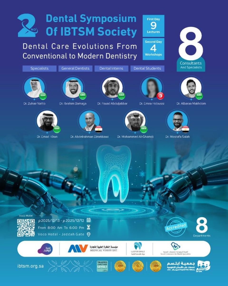 Held at the Voco Hotel – Jeddah Gate, the event welcomes dentists from all professional levels—specialists, general practitioners, interns, and students. The symposium emphasizes innovation in dental care, digital dentistry, robotics-assisted dentistry, and best-practice clinical approaches, supporting the continuous advancement of dental healthcare in the region.