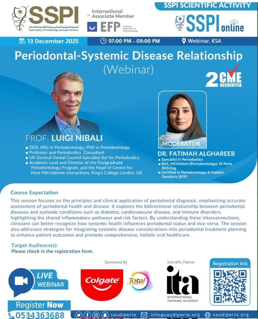 The Periodontal–Systemic Disease Relationship Webinar, organized by the Saudi Society of Periodontology and Implant Dentistry (SSPI), is an advanced scientific activity highlighting the complex links between oral health and systemic diseases. Delivered by Prof. Luigi Nibali, the session focuses on the latest clinical and scientific evidence showing how periodontal inflammation intersects with conditions such as diabetes, cardiovascular diseases, immune disorders, and other systemic health issues. This webinar provides healthcare professionals with a deeper understanding of how local oral inflammation contributes to broader systemic outcomes.