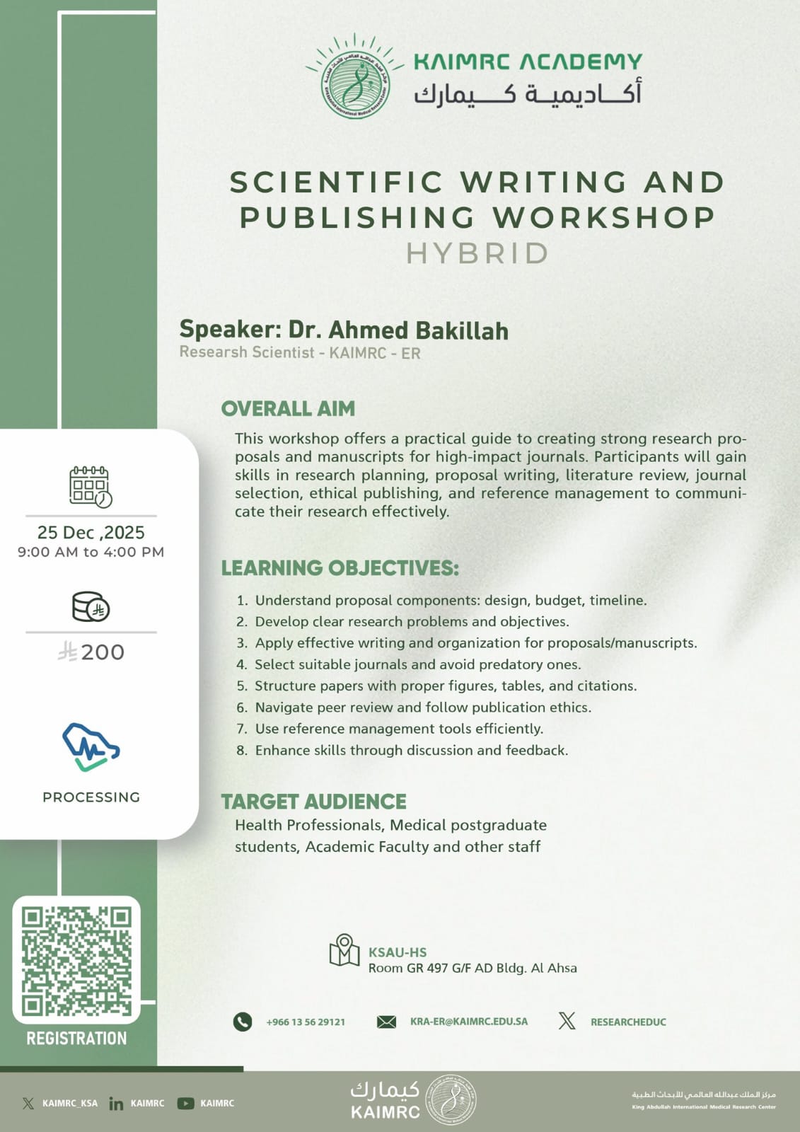 The Scientific Writing and Publishing Workshop (Hybrid) is an intensive educational event organized by KAIMRC Academy, part of the King Abdullah International Medical Research Center. This workshop is designed to equip healthcare professionals and academic researchers with essential skills for developing high-quality research proposals and manuscripts suitable for publication in high-impact scientific journals.