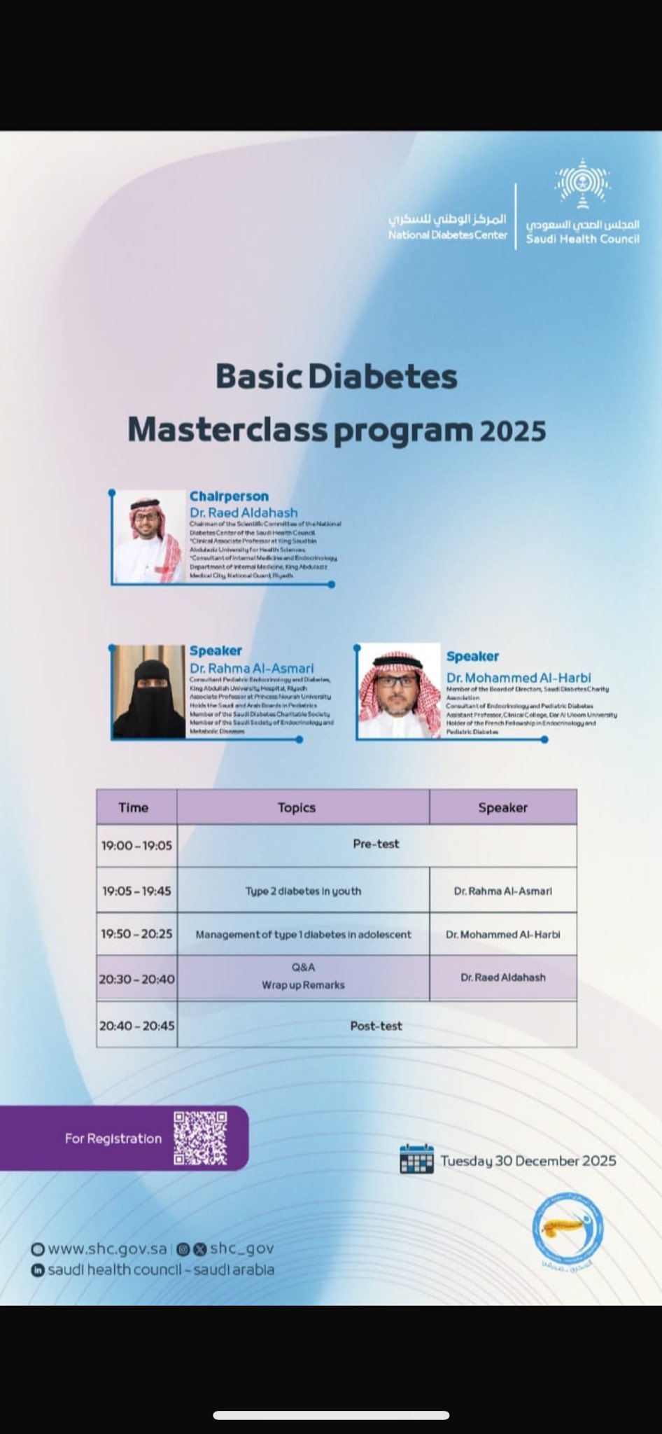 The Basic Diabetes Masterclass Program 2025 is an educational medical event organized by the Saudi Health Council in collaboration with the National Diabetes Center. This masterclass aims to enhance foundational knowledge and clinical understanding of diabetes, with a special focus on pediatric and adolescent populations. The program brings together expert speakers to discuss current challenges, evidence-based practices, and practical approaches in diabetes care.