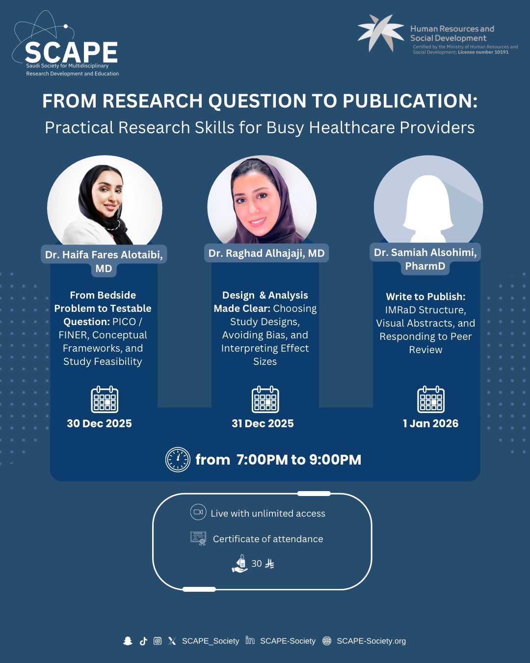 From Research Question to Publication: Practical Research Skills for Busy Healthcare Providers is a comprehensive educational program organized by the Saudi Society for Multidisciplinary Research Development and Education (SCAPE). This multi-day course is designed to equip healthcare professionals with essential research skills, guiding them step by step from identifying a clinical problem to successfully publishing a scientific paper.