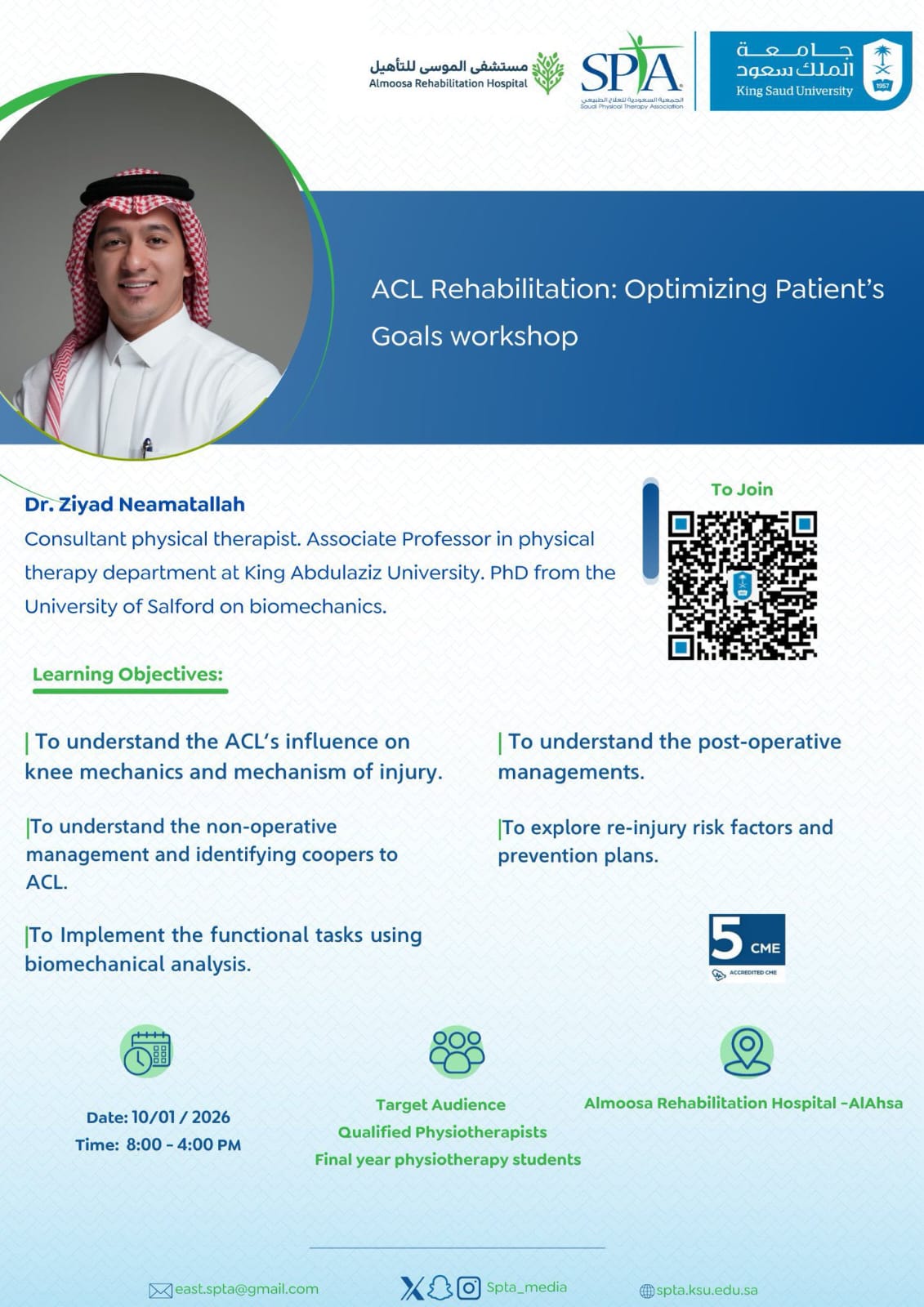 The workshop will be delivered by Dr. Ziyad Neamatallah, Consultant Physical Therapist and Associate Professor of Physical Therapy, whose expertise in biomechanics and rehabilitation science provides participants with advanced knowledge in both operative and non-operative ACL care. The program emphasizes knee biomechanics, functional task implementation, re-injury prevention, and post-operative rehabilitation planning, ensuring practical and clinically applicable learning.