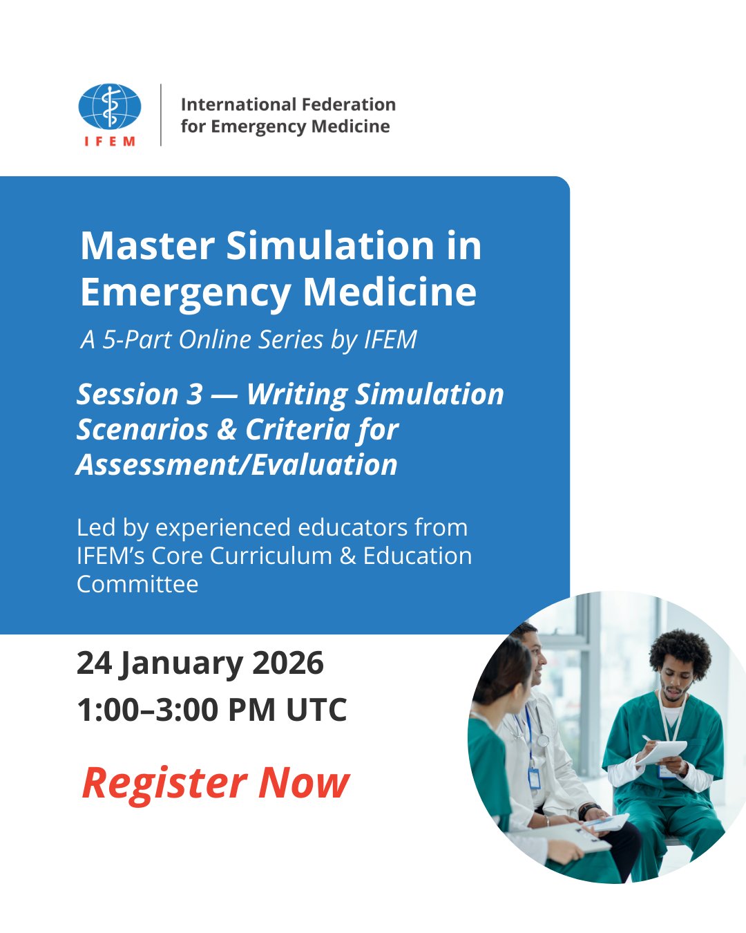 Scheduled on 24 January 2026, this interactive online session is led by experienced educators from IFEM’s Core Curriculum and Education Committee. The session aims to equip participants with practical tools to design high-quality simulation scenarios and apply appropriate assessment and evaluation criteria, supporting excellence in emergency medicine training and education.