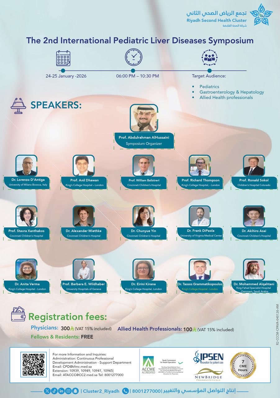 The 2nd International Pediatric Liver Diseases Symposium is an advanced scientific meeting organized by the Riyadh Second Health Cluster, bringing together international experts to discuss the latest developments in pediatric liver diseases. The symposium focuses on evidence-based diagnosis, management, and emerging therapies in pediatric hepatology, fostering knowledge exchange between global leaders and local healthcare professionals.