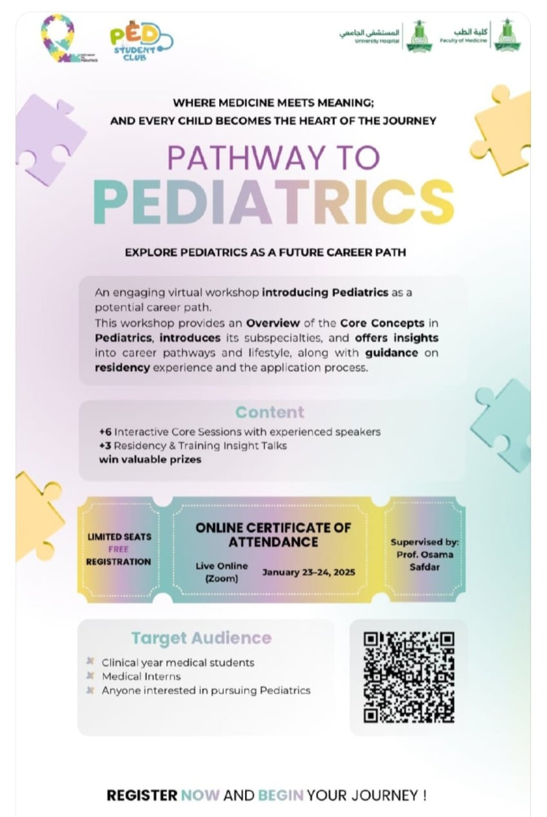 The “Pathway to Pediatrics” event is an engaging virtual educational initiative designed to introduce medical students and interns to pediatrics as a future career pathway. The workshop highlights the fundamental principles of pediatric medicine while emphasizing the humanistic and compassionate aspects of caring for children. Through expert-led sessions, participants gain insight into how pediatrics integrates science, empathy, and long-term patient impact.
