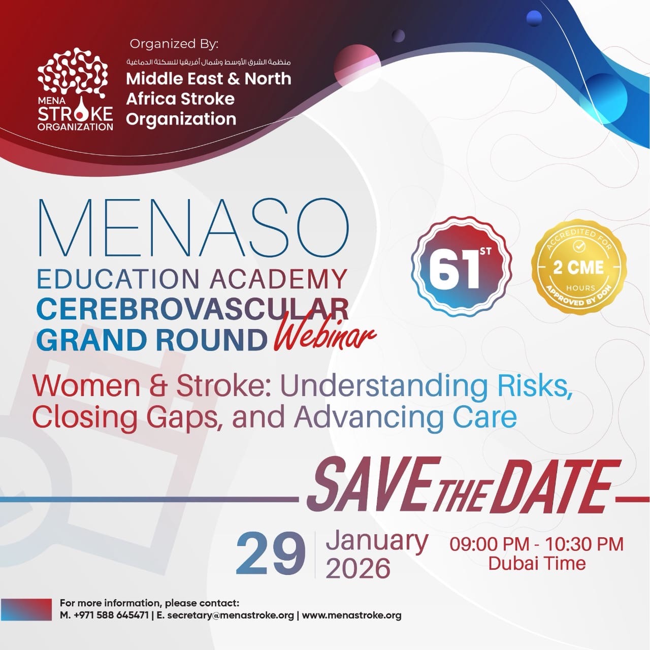 The webinar aims to advance evidence-based cerebrovascular care for women by highlighting disparities, promoting tailored prevention strategies, and improving clinical decision-making. As part of MENASO’s continuous medical education efforts, this grand round brings together healthcare professionals to enhance stroke awareness, optimize management strategies, and foster equity in stroke care delivery.