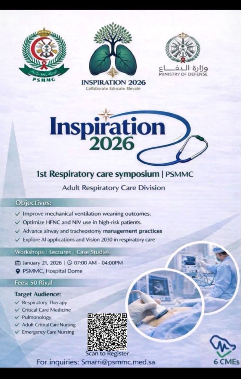 The Inspiration 2026 – 1st Respiratory Care Symposium is a specialized medical event organized by the Adult Respiratory Care Division at Prince Sultan Military Medical City (PSMMC). This symposium is designed to bring together healthcare professionals involved in respiratory and critical care to share knowledge, enhance clinical skills, and discuss evidence-based practices in adult respiratory management. The event emphasizes collaboration, education, and professional development in alignment with modern healthcare goals and Vision 2030.