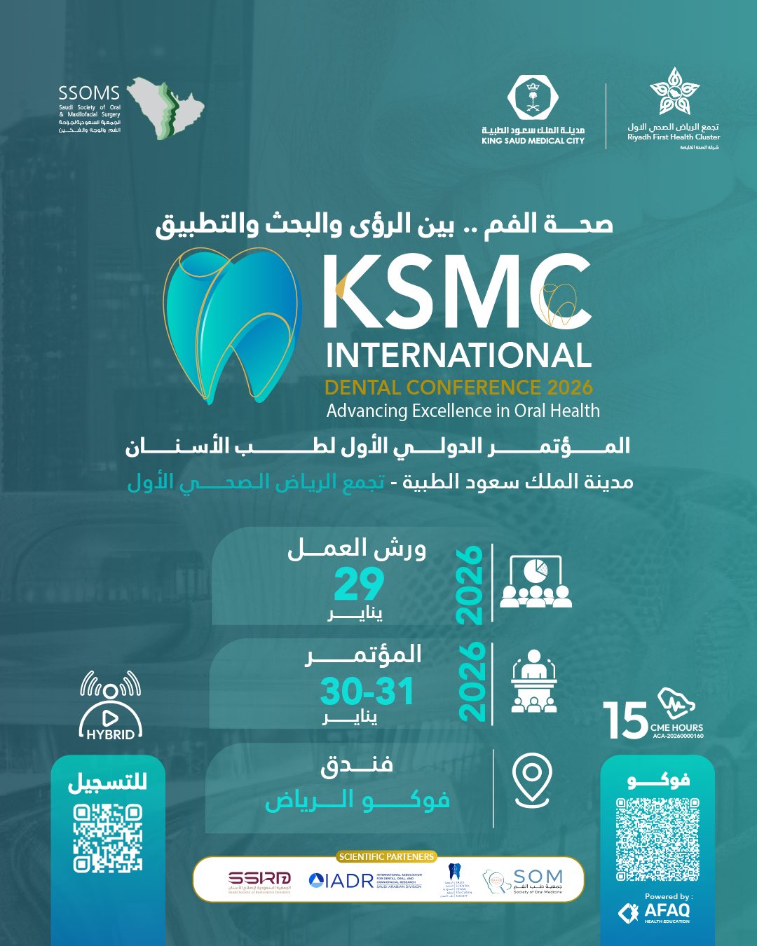 The KSMC International Dental Conference 2026 is the first international dental conference organized by King Saud Medical City in collaboration with leading national and international scientific partners. The conference focuses on advancing excellence in oral health by bridging vision, research, and clinical application. It brings together distinguished speakers, researchers, and clinicians to share the latest innovations, evidence-based practices, and emerging trends in dentistry.