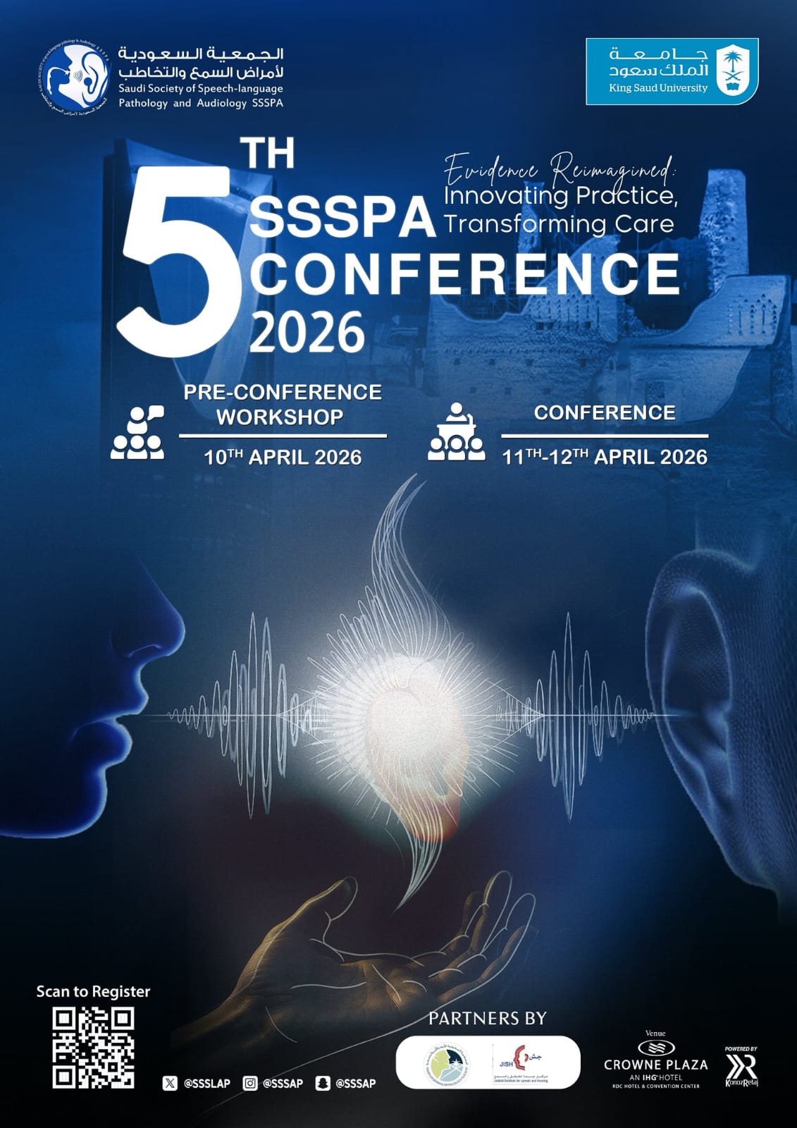 The SSSPA Conference is the most comprehensive regular education event in the Gulf region for speech, language, and hearing professionals. Our conference will provide an opportunity to expand your knowledge in terms of research and updated evidence-based practice guidelines for clinical assessment and management. It will provide clinicians with hands-on training which could include technology/device specific skills, introduce new products and resources and provide golden networking opportunities with international leaders in the fields and colleagues. Accomplish all that while earning continuing medical education hours from the Saudi Commission for Health Specialties (SCFHS) and continuing education credit from the American Speech-Language-Hearing Association (ASHA).