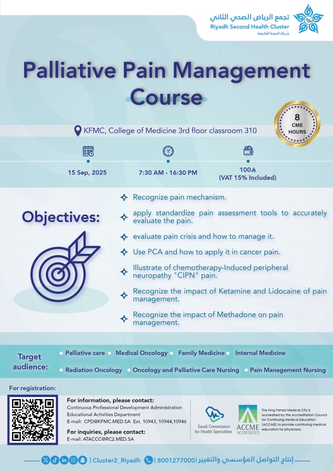The Palliative Pain Management Course is organized by the Riyadh Second Health Cluster and will be held on September 15, 2025, at King Fahad Medical City (KFMC), College of Medicine, 3rd floor classroom 310. This one-day event runs from 7:30 AM to 4:30 PM and offers 8 CME Hours accredited by the Saudi Commission for Health Specialties and ACCME. The course is designed to provide healthcare professionals with updated knowledge and practical skills in managing pain, with a focus on palliative and oncology patients.