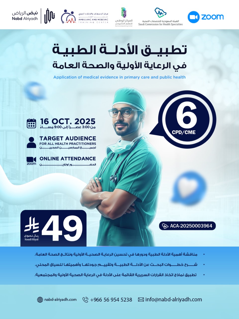 The Application of Medical Evidence in Primary Care and Public Health (medical conference / course) is scheduled for 16 October 2025, hosted by Nabd Al-Riyadh. This 6-hour event is designed to empower participants with the skills to critically appraise, interpret, and apply medical evidence in both clinical primary care and public health settings. Through lectures and interactive discussion, attendees will examine evidence-based medicine principles, methods for assessing study quality, techniques for integrating evidence into local practice, and strategies for overcoming implementation challenges in health systems.