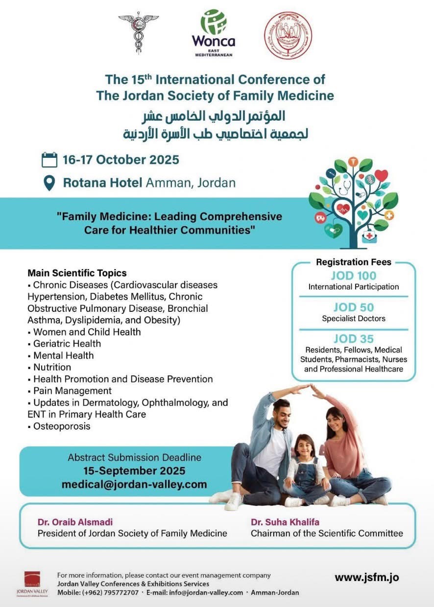 The 15th International Conference of the Jordan Society of Family Medicine will take place on 16–17 October 2025 at Rotana Hotel, Amman, Jordan, under the theme “Family Medicine: Leading Comprehensive Care for Healthier Communities.” This major scientific event will gather family physicians, specialists, and healthcare professionals to discuss innovative approaches in family medicine and community health.