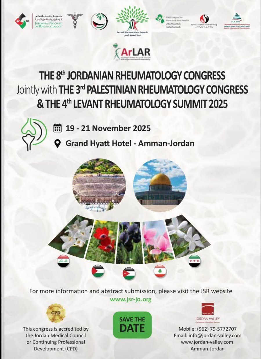 The 8th Jordanian Rheumatology Congress, held jointly with the 3rd Palestinian Rheumatology Congress and the 4th Levant Rheumatology Summit 2025, will take place from 19–21 November 2025 at the Grand Hyatt Hotel, Amman–Jordan. This prestigious regional event brings together leading rheumatologists, researchers, and healthcare professionals from across the Middle East to exchange knowledge and discuss the latest advances in the diagnosis and management of rheumatic diseases.