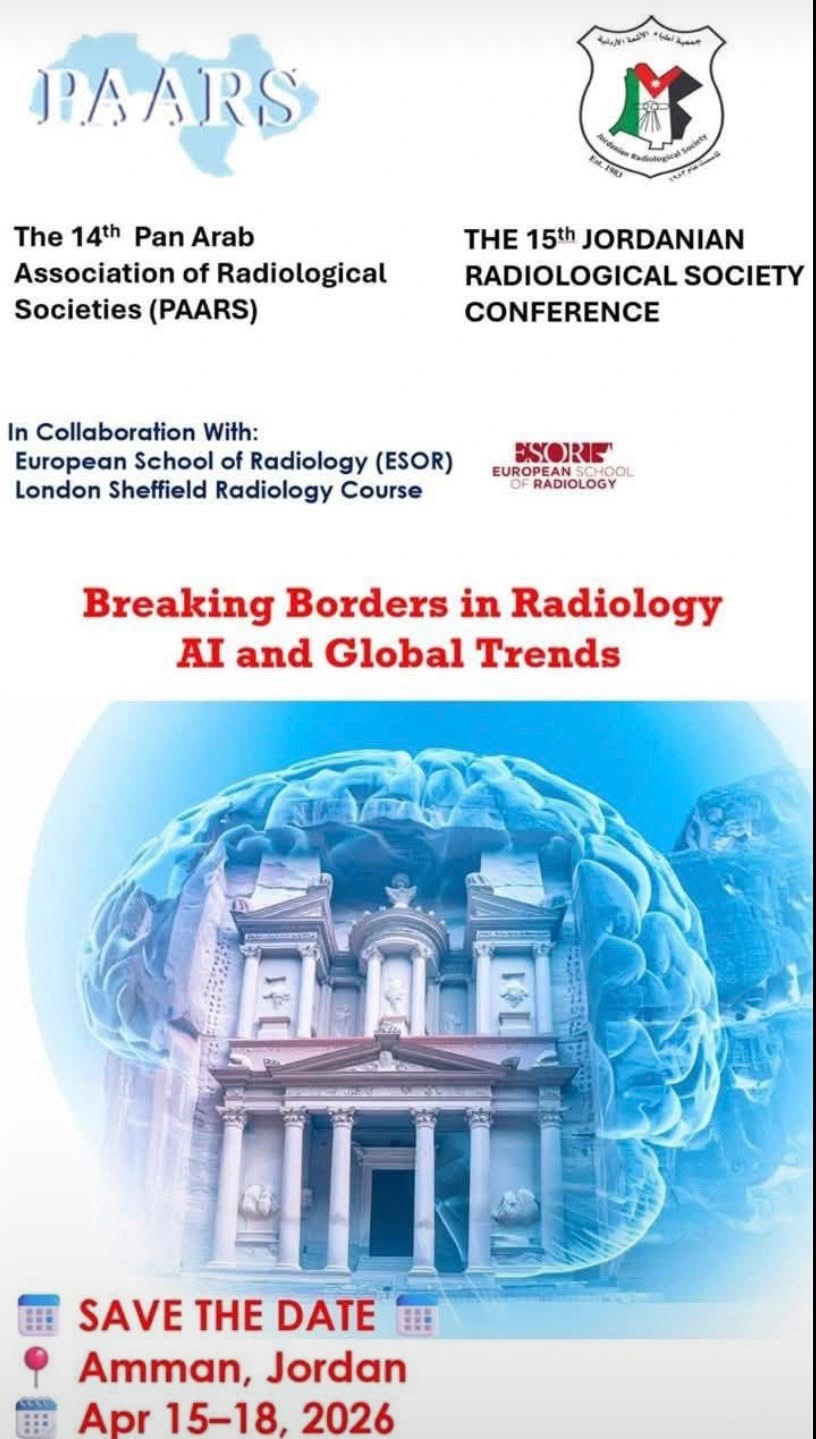 The 15th Jordanian Radiological Society Conference, held in conjunction with the 14th Pan Arab Association of Radiological Societies (PAARS) Congress, will take place from April 15–18, 2026, in Amman, Jordan. Organized in collaboration with the European School of Radiology (ESOR) and the London Sheffield Radiology Course, this event will bring together radiologists, imaging specialists, and researchers from across the region and beyond under the theme “Breaking Borders in Radiology: AI and Global Trends.”