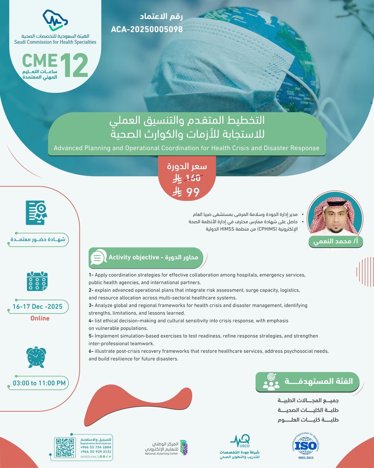 The “Advanced Planning and Operational Coordination for Health Crisis and Disaster Response” course is an accredited professional program by the Saudi Commission for Health Specialties (SCFHS). It aims to enhance the readiness and resilience of healthcare professionals in managing public health emergencies, disasters, and crisis situations. The course provides a comprehensive understanding of coordination mechanisms among hospitals, emergency services, and public health agencies to ensure effective and timely responses.