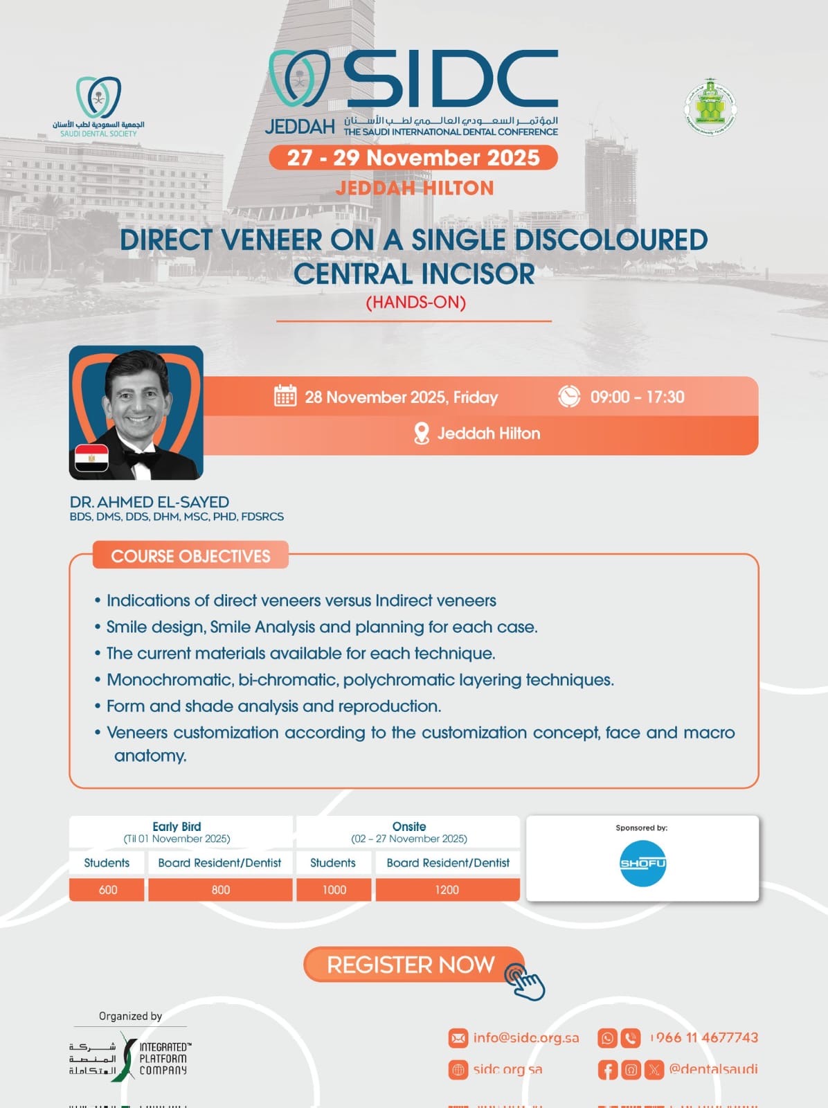 The Saudi International Dental Conference (SIDC) 2025 is hosting an intensive hands-on workshop titled “Direct Veneer on a Single Discoloured Central Incisor.” This specialized program will take place on 28 November 2025 at the Jeddah Hilton, led by the distinguished instructor Dr. Ahmed El-Sayed. The course is designed to give dental professionals a deeper understanding of the principles, techniques, and clinical decision-making involved in restoring a single discoloured maxillary central incisor using direct veneer techniques.