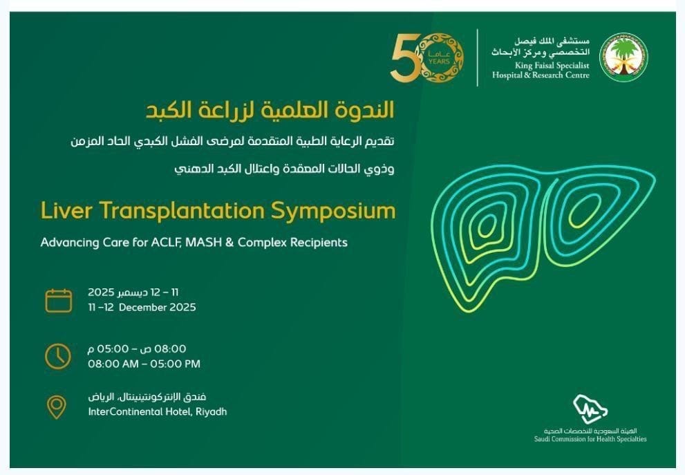 The Liver Transplantation Symposium 2025, hosted by King Faisal Specialist Hospital & Research Centre, is a leading scientific meeting focused on advancing clinical care for liver failure and complex transplant recipients. This symposium highlights cutting-edge approaches in managing Acute-on-Chronic Liver Failure (ACLF), Metabolic Dysfunction–Associated Steatohepatitis (MASH), and patients with advanced hepatic dysfunction. Through a series of expert-led sessions, attendees will gain updated insights into patient selection, perioperative care, surgical advancement, postoperative management, and multidisciplinary coordination in liver transplantation.