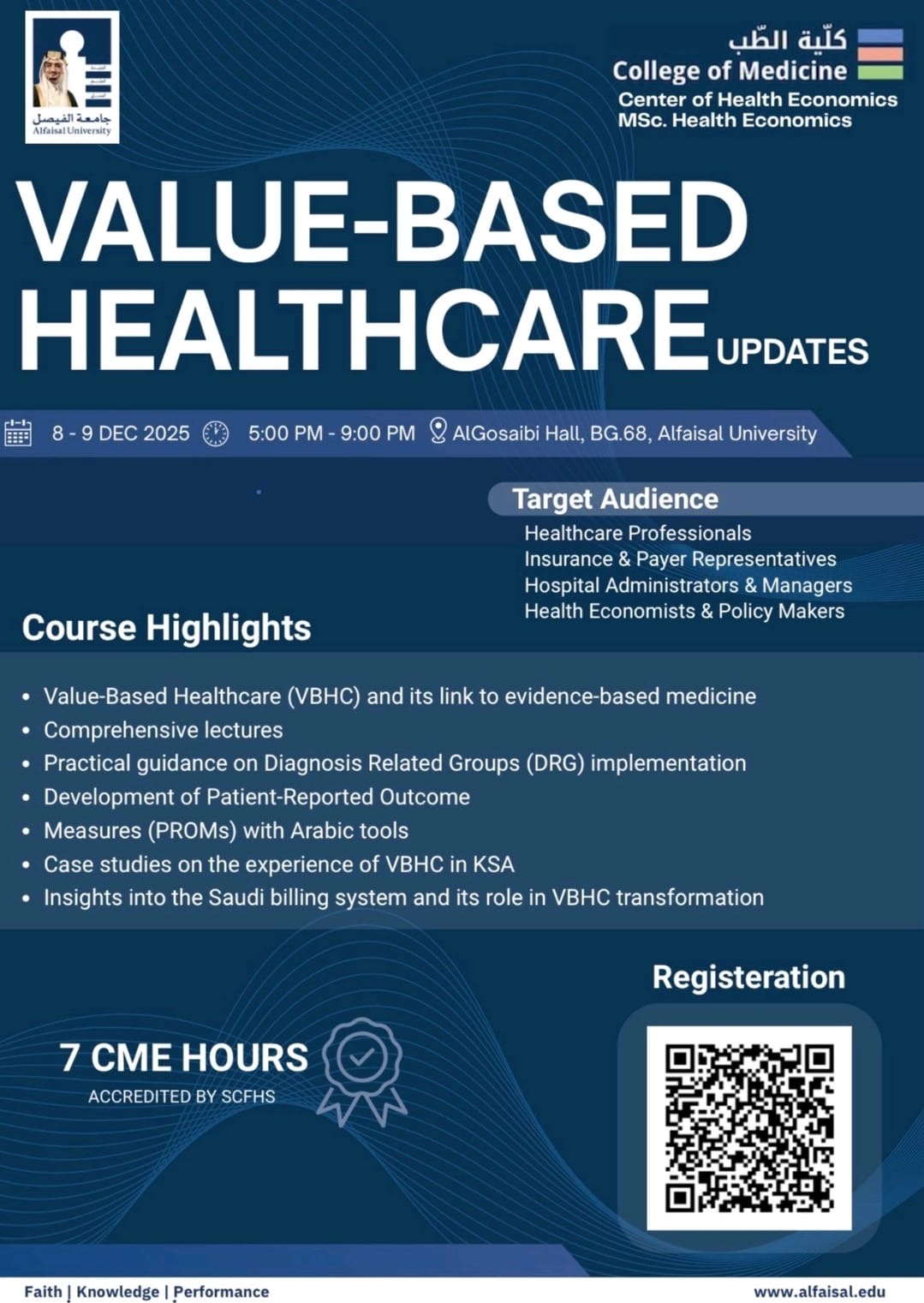 The Value-Based Healthcare Updates Course, organized by Alfaisal University’s College of Medicine and the Center of Health Economics, is a specialized educational program designed to strengthen the understanding and implementation of value-based healthcare (VBHC). This course focuses on aligning healthcare delivery with patient-centered outcomes, efficiency, and evidence-based practices. Through expert-led lectures and real-world case studies, participants will gain essential insights into the transformation of healthcare systems in Saudi Arabia and globally.