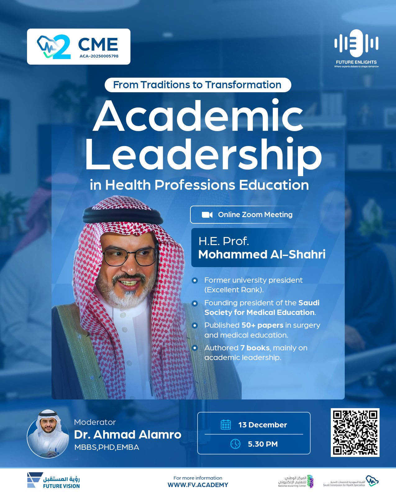The event “Academic Leadership in Health Professions Education – From Traditions to Transformation” is an advanced academic session designed to explore the evolving landscape of leadership in medical and health education. Led by H.E. Prof. Mohammed Al-Shahri, a distinguished academic leader, former university president, and founding president of the Saudi Society for Medical Education, the session provides invaluable insights into modern leadership models that shape medical institutions today. Participants will learn from his extensive experience, including the publication of more than 50 research papers and the authorship of multiple books on academic leadership.