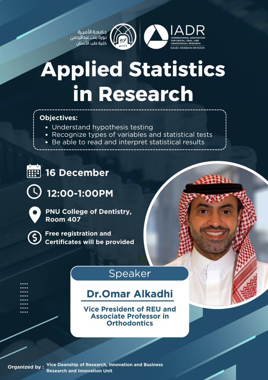 Led by Dr. Omar Alkadhi, Vice President of REU and Associate Professor in Orthodontics, the workshop offers practical guidance on interpreting statistical outputs and applying them effectively in academic and clinical research settings. With free registration and certificates provided, the event aims to promote research excellence and foster a deeper understanding of how statistical methods support scientific advancements in dentistry and health sciences.