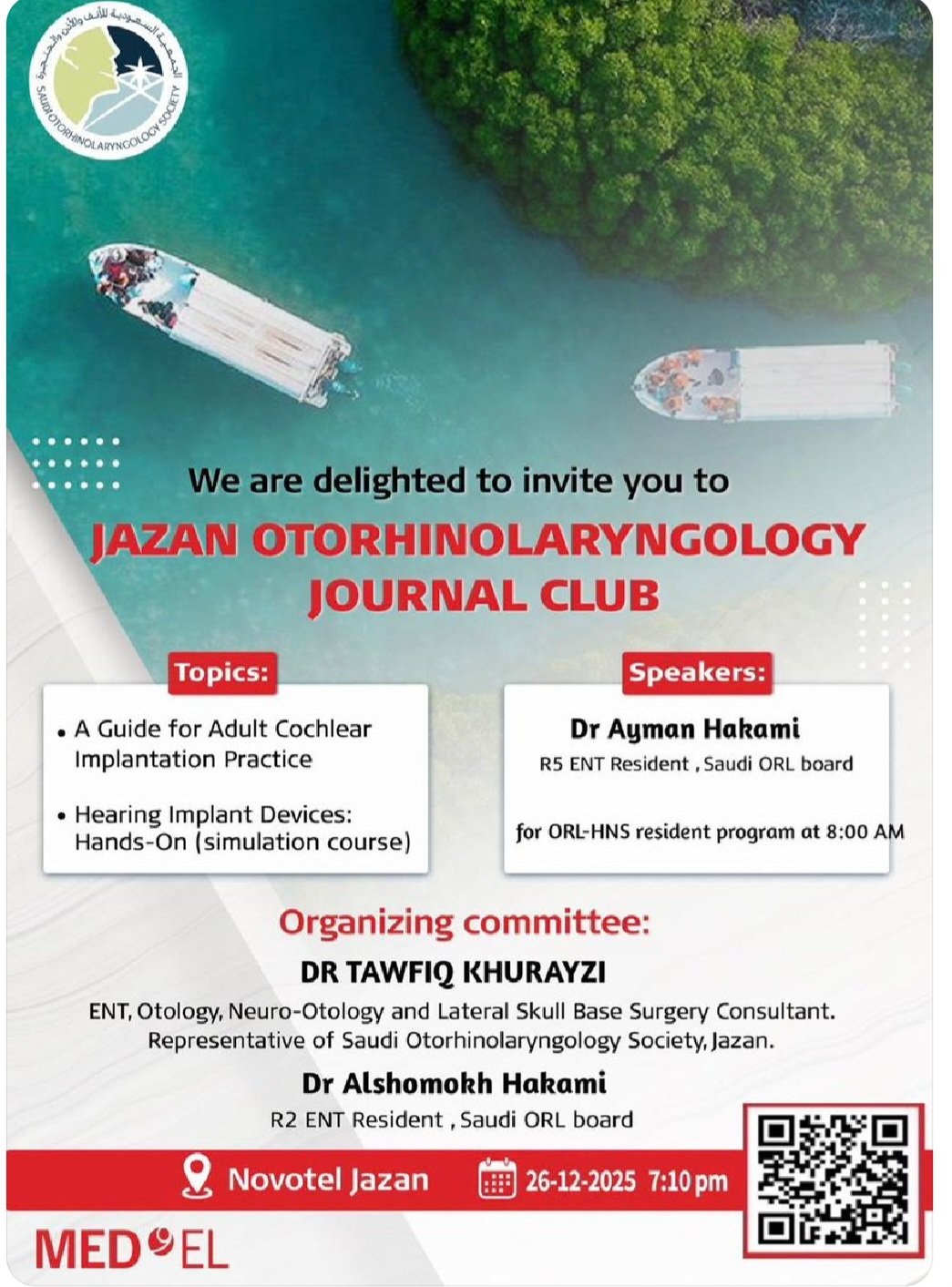 The Jazan Otorhinolaryngology Journal Club is an educational scientific event designed to enhance the knowledge and clinical skills of ENT residents and practitioners in the field of otorhinolaryngology. The event focuses on evidence-based practice and practical exposure to advanced hearing implant techniques, with special emphasis on adult cochlear implantation and hearing implant devices.