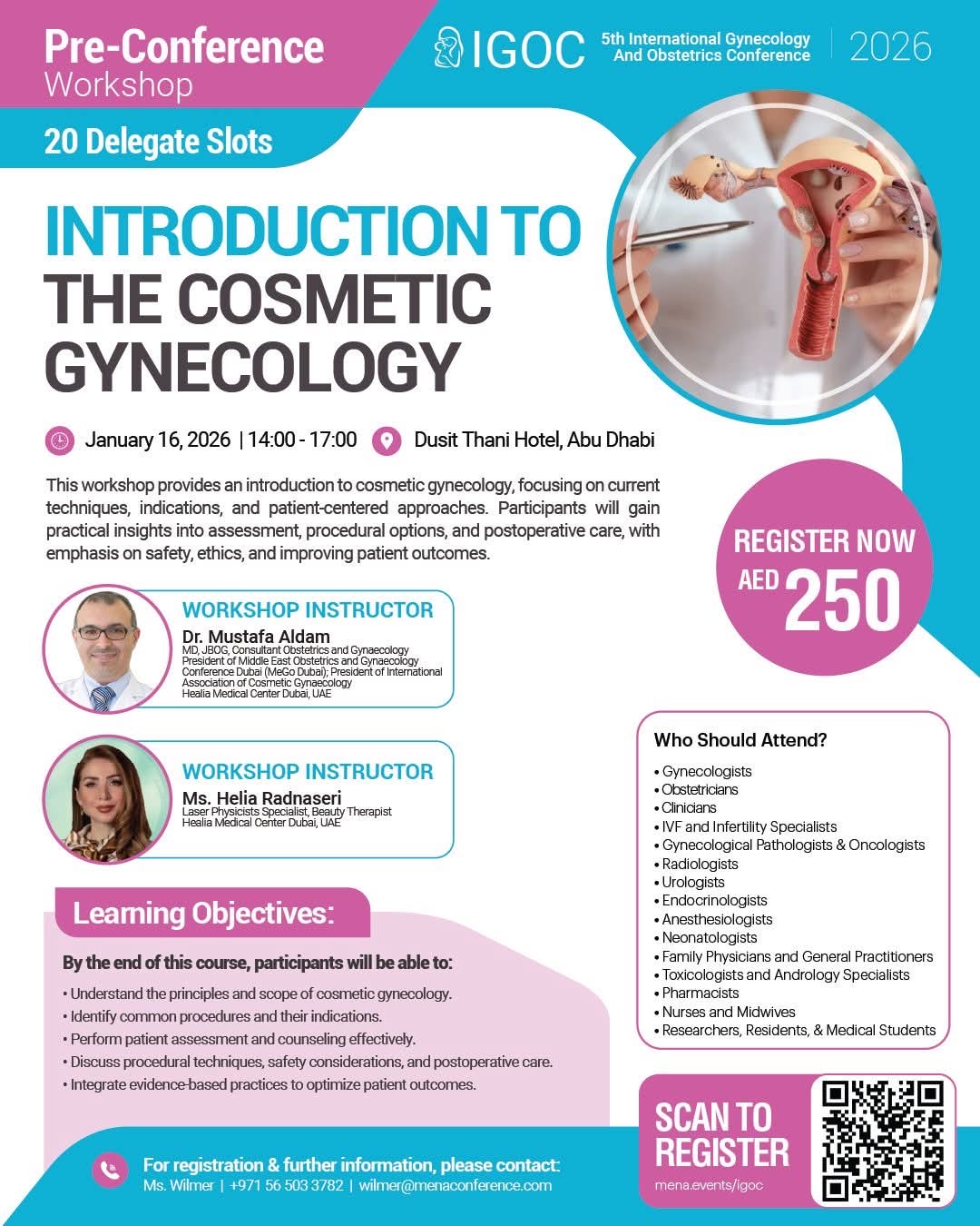 The Introduction to Cosmetic Gynecology Workshop is a focused pre-conference educational activity held as part of the 5th International Gynecology and Obstetrics Conference (IGOC) 2026. Taking place on January 16, 2026, at Dusit Thani Hotel, Abu Dhabi, this workshop is designed to introduce participants to the evolving field of cosmetic gynecology with an emphasis on modern techniques, clinical indications, and patient-centered care.