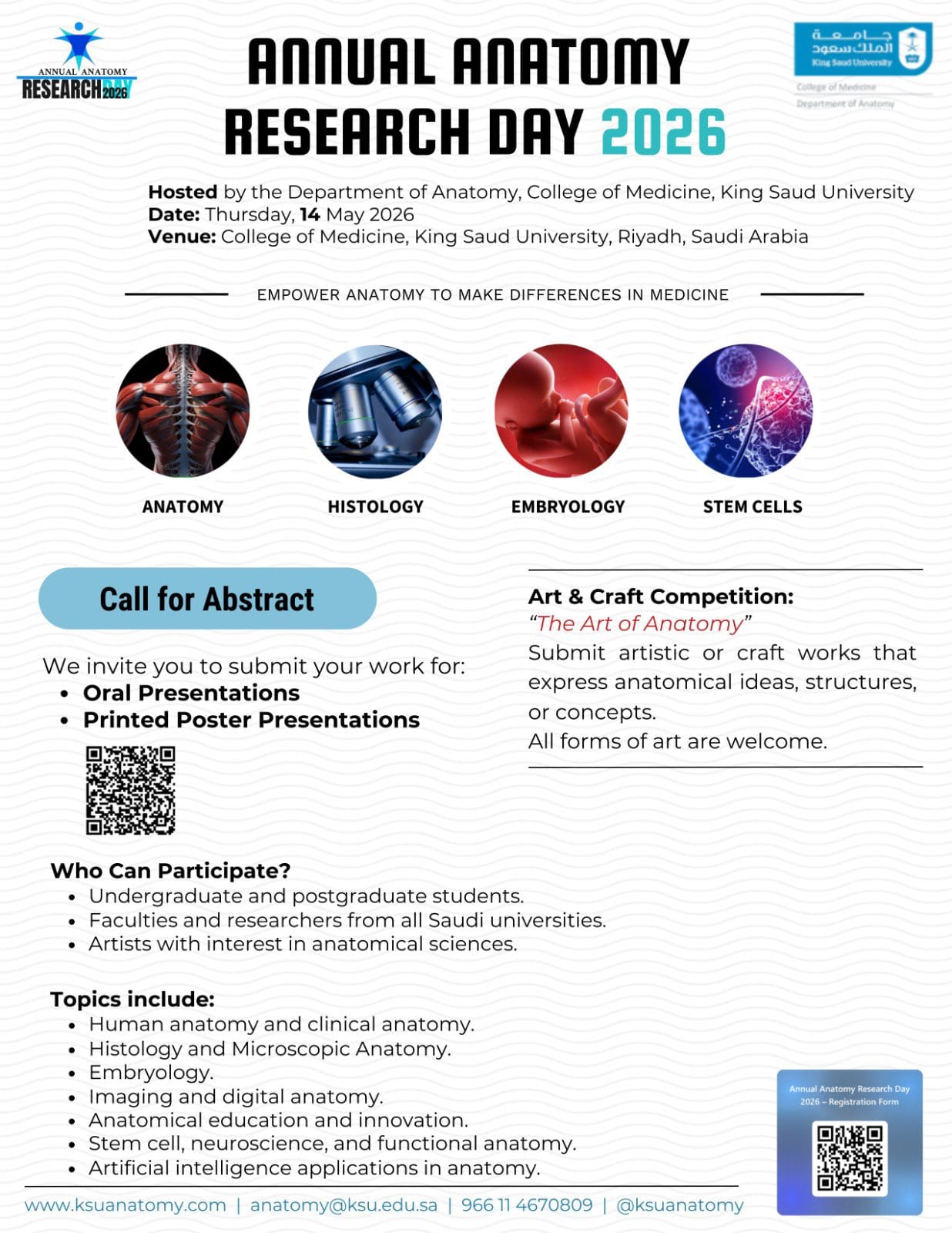 The Annual Anatomy Research Day 2026 is a scientific academic event organized by the Department of Anatomy, College of Medicine, King Saud University, and will take place on Thursday, 14 May 2026, at the College of Medicine, King Saud University, Riyadh, Saudi Arabia. The event aims to highlight the essential role of anatomical sciences in advancing medical knowledge, research, and education, under the theme “Empower Anatomy to Make Differences in Medicine.”