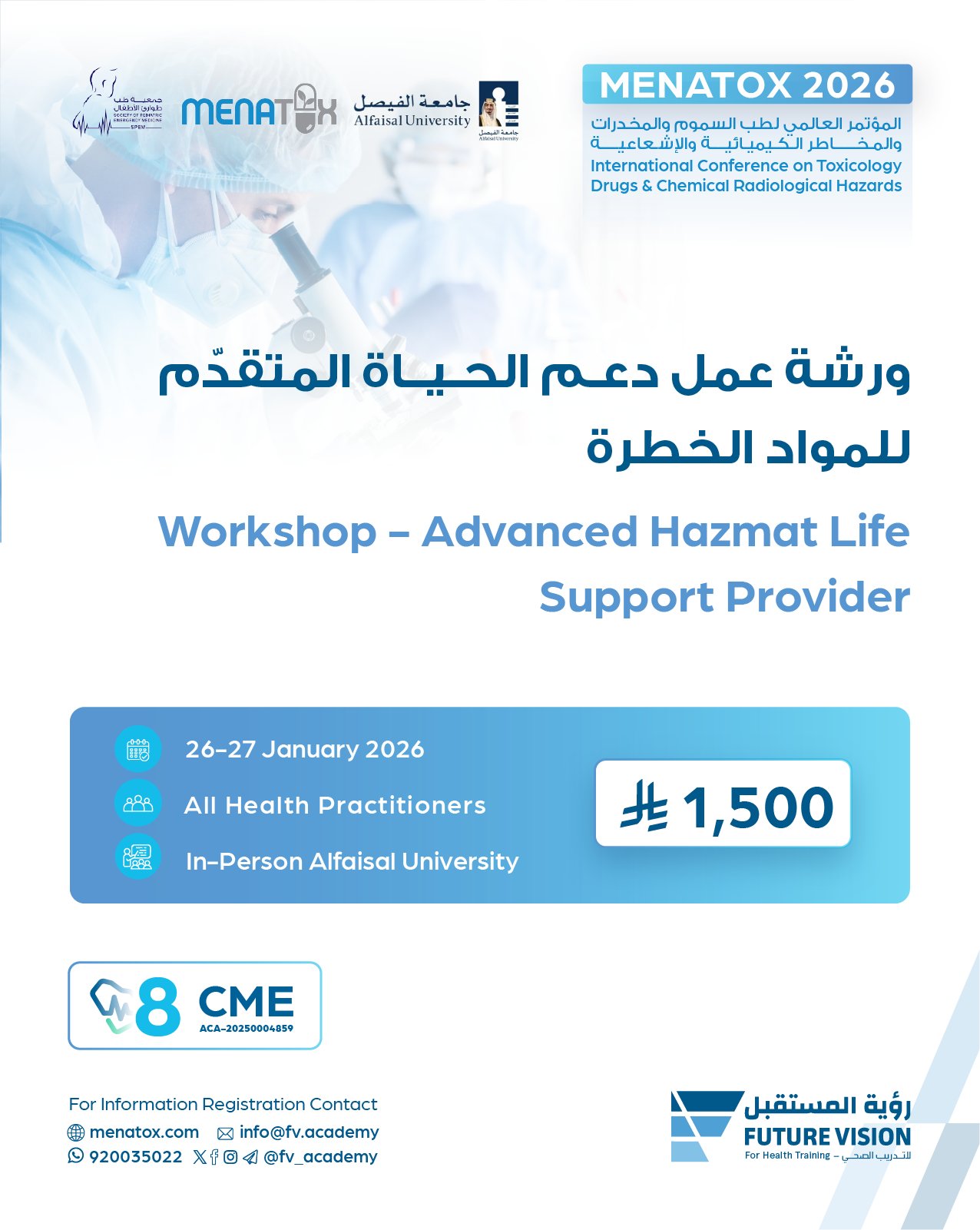 Taking place on 26–27 January 2026 at Alfaisal University, the workshop provides in-person, hands-on learning delivered by experts in toxicology and emergency preparedness. The program is accredited for 8 CME hours, ensuring participants gain both practical skills and recognized continuing medical education credits that support professional development and patient safety.