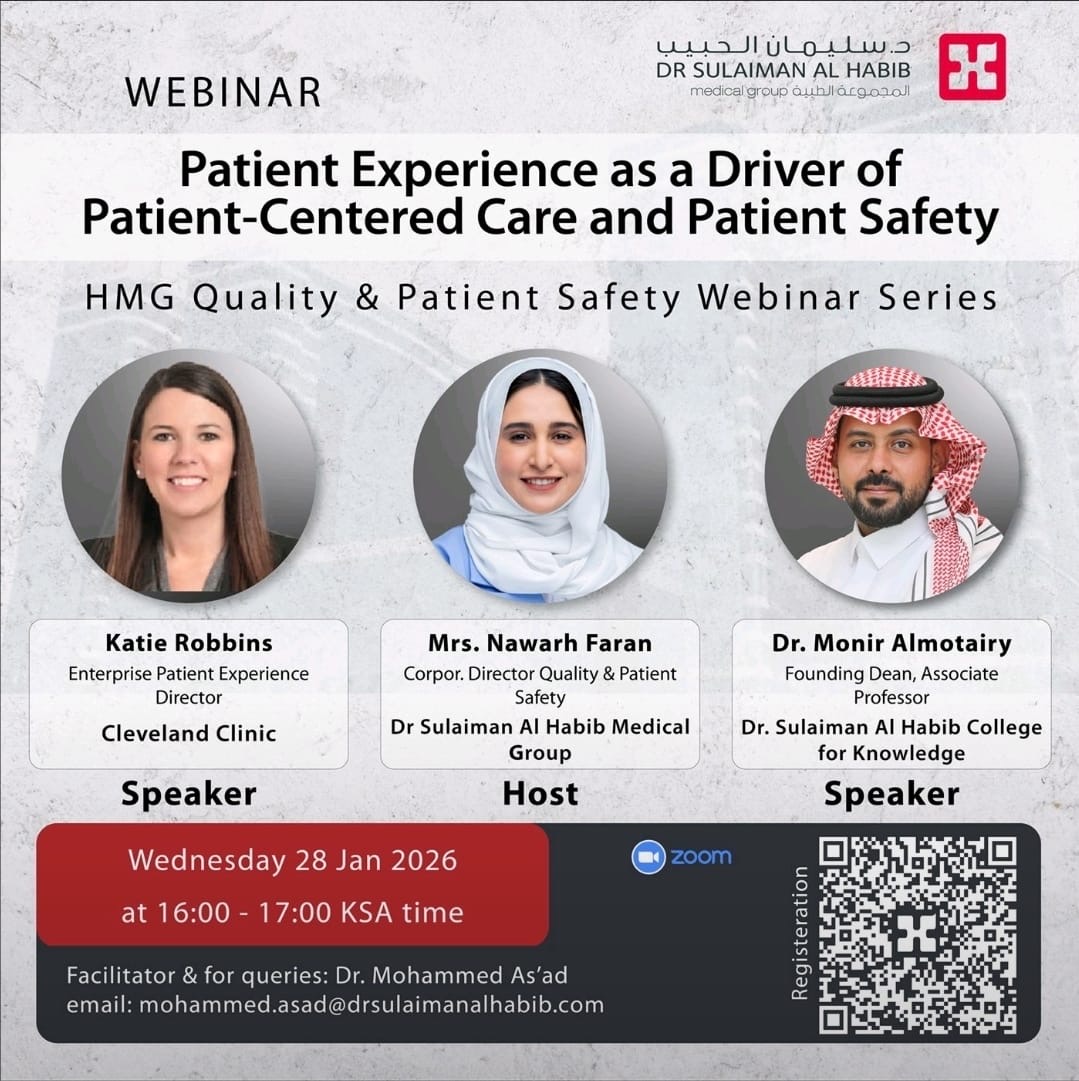 The webinar “Patient Experience as a Driver of Patient-Centered Care and Patient Safety” is part of the HMG Quality & Patient Safety Webinar Series, organized by Dr. Sulaiman Al Habib Medical Group (HMG). The event focuses on the growing role of patient experience as a fundamental pillar in improving healthcare quality, enhancing safety outcomes, and strengthening patient-centered care models across healthcare systems.